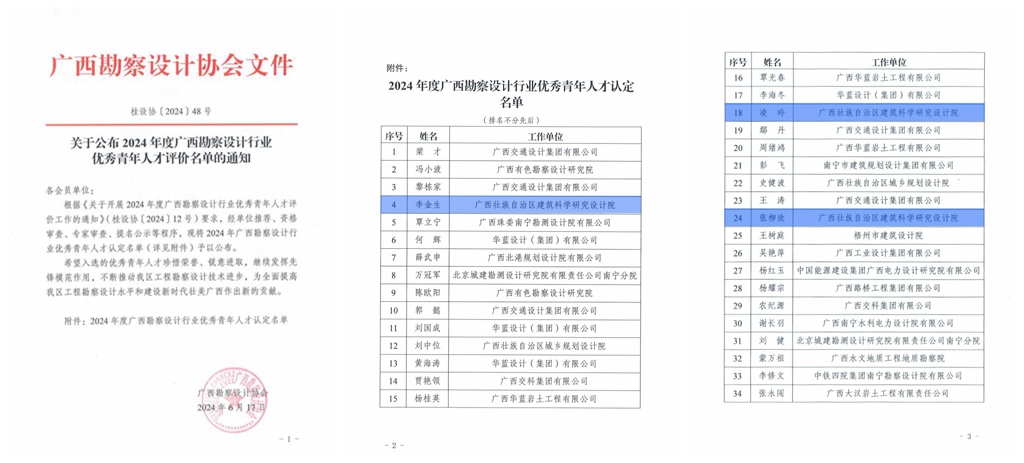 近日,廣西勘察設(shè)計協(xié)會公布了2024年度廣西勘察設(shè)計行業(yè)優(yōu)秀青年人才認(rèn)定名單。我院李金生、凌玲、張柳欣3位設(shè)計師獲“2024年度廣西勘察設(shè)計行業(yè)優(yōu)秀青年人才”認(rèn)定,這是我院人才隊伍建設(shè)取得的又一成績。