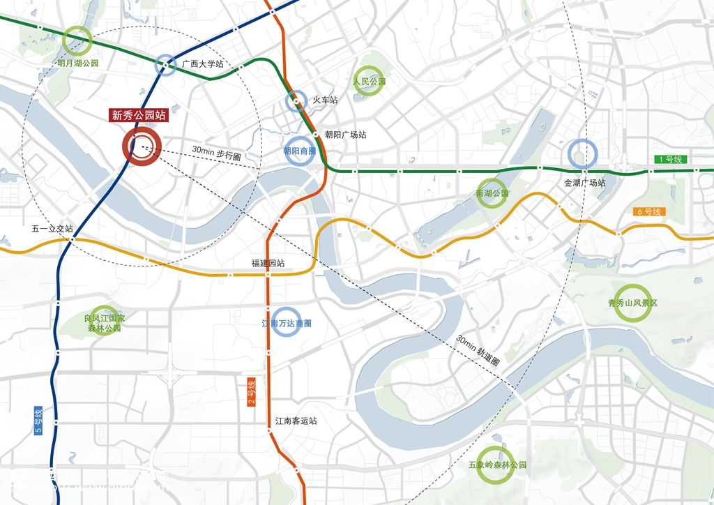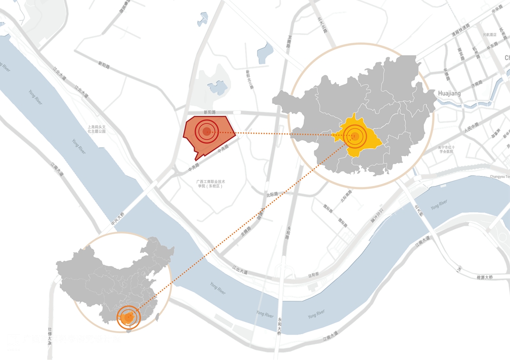 項目位于中堯路48號原南寧機械廠舊址,區位上毗鄰朝陽商圈,位于東西城市發展軸和邕江城市河流之間。場地周邊交通能級較高,利用TOD 軌交系統輻射城市大部分區域,半小時內直達新老城區核心商務圈,影響力較大。項目用地面積約 221 畝,總建筑面積約 9.95 萬平方米。