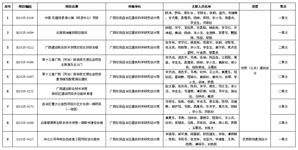 近日,廣西壯族自治區住房和城鄉建設廳公布了2025年廣西優秀工程勘察設計成果等次評定結果。我院共有9個項目獲獎。其中:優秀(公共)建筑設計獎8項:一等獎2項、二等獎4項、三等獎2項;優秀園林景觀設計獎1項:一等獎1項。