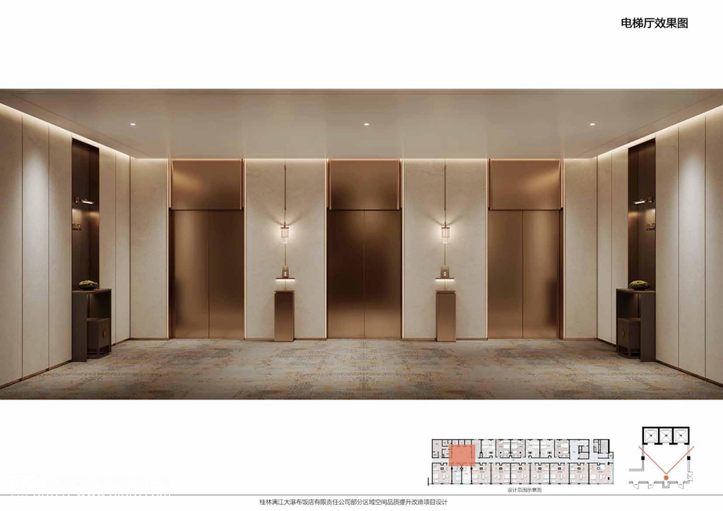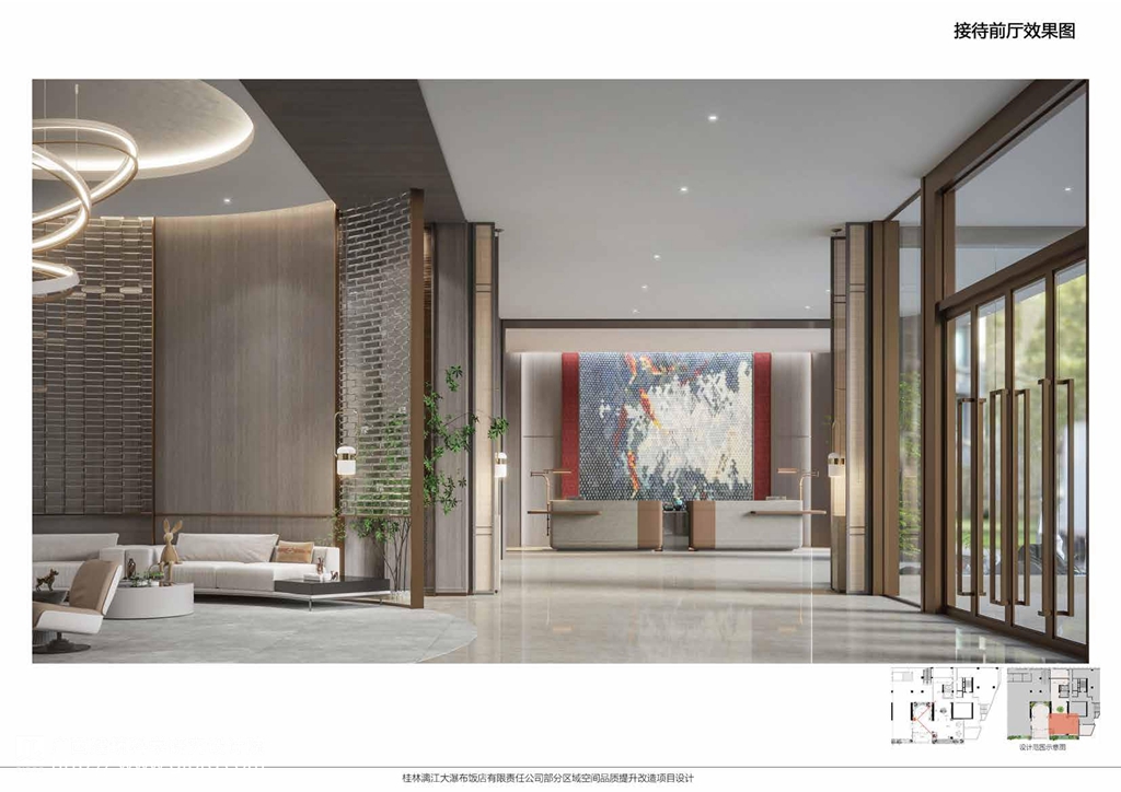 本項目是城市更新背景下,城市酒店改造品質提升裝修設計項目,由我院環境藝術專業設計院牽頭設計。桂林漓江大瀑布飯店位于桂林市中心景區,緊鄰兩江四湖日月雙塔和市中心廣場、步行街,前望風光無限,后依熙擡商圈,主體建筑高度56米,極具景觀視野,能遠跳漓江及象鼻山景觀,是鬧市中品味桂林山水的絕佳位置。